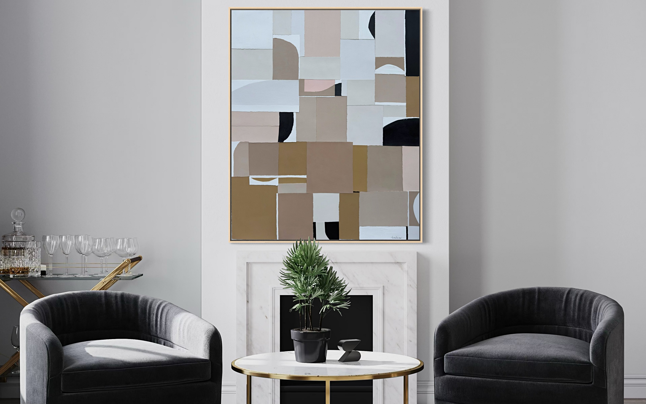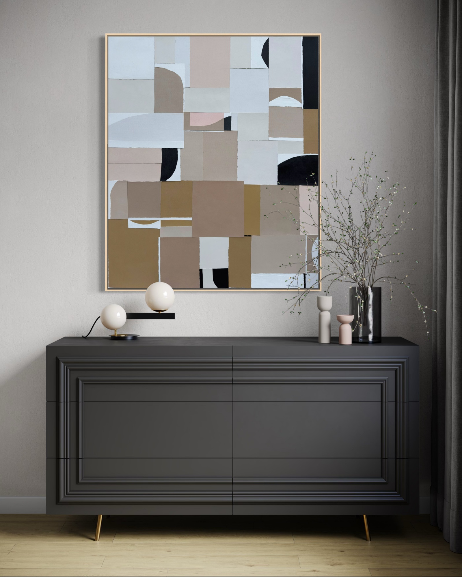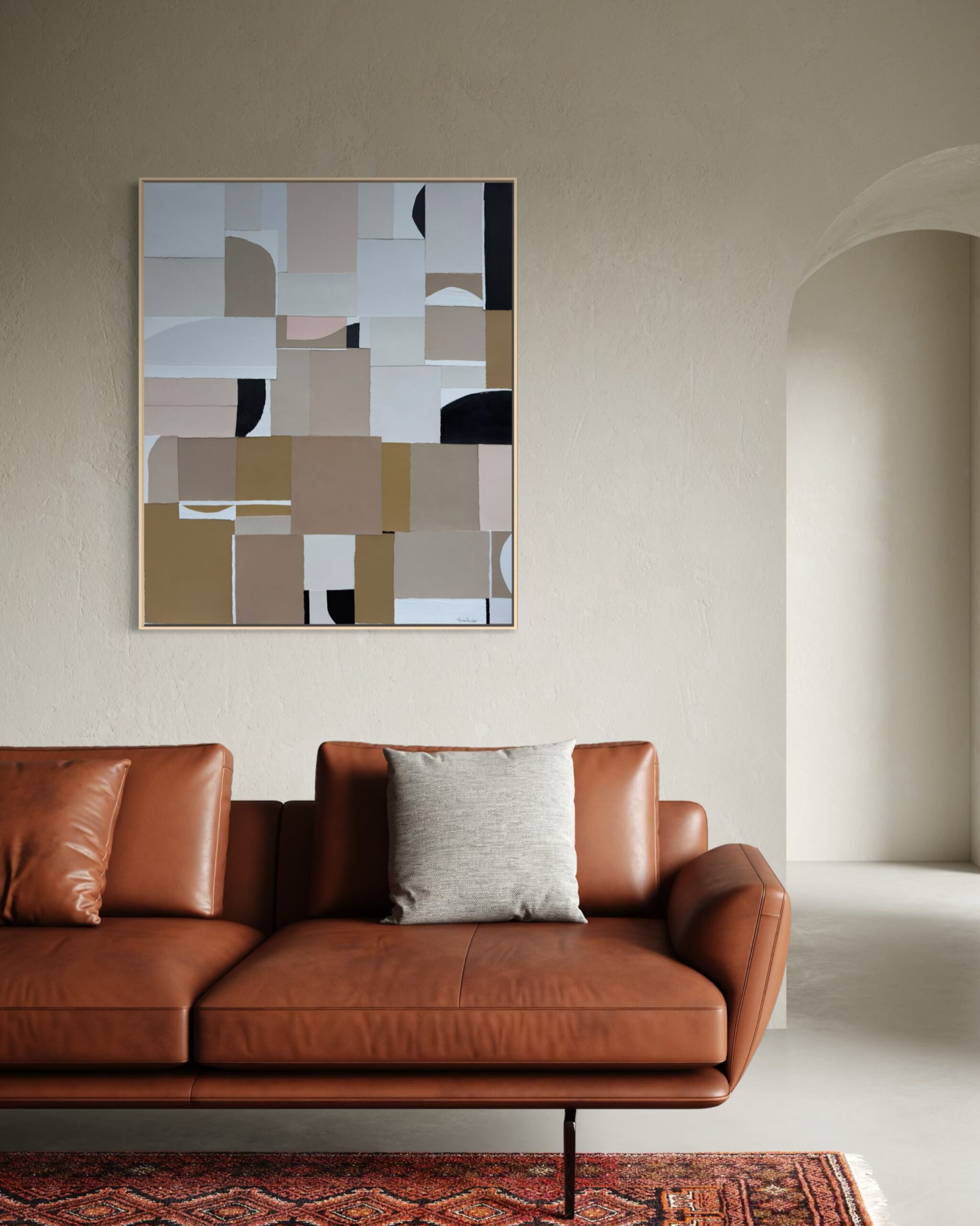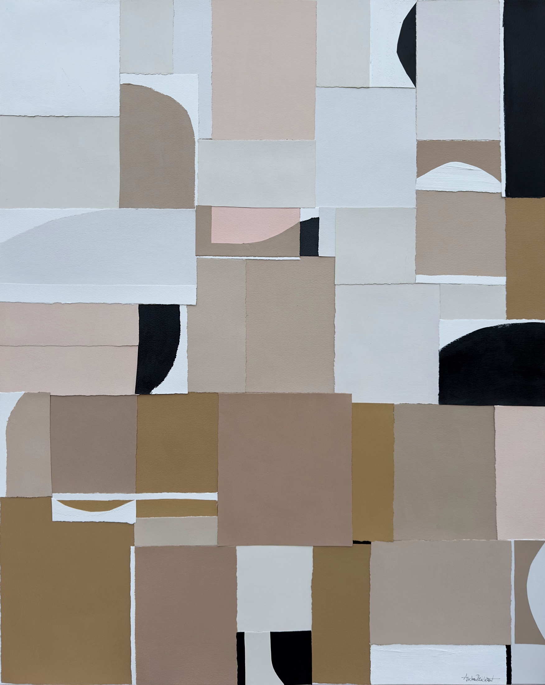 Hand painted acrylic, mixed media, handmade paper on stretched canvas. Sides painted (white). Slim real wood frame included.